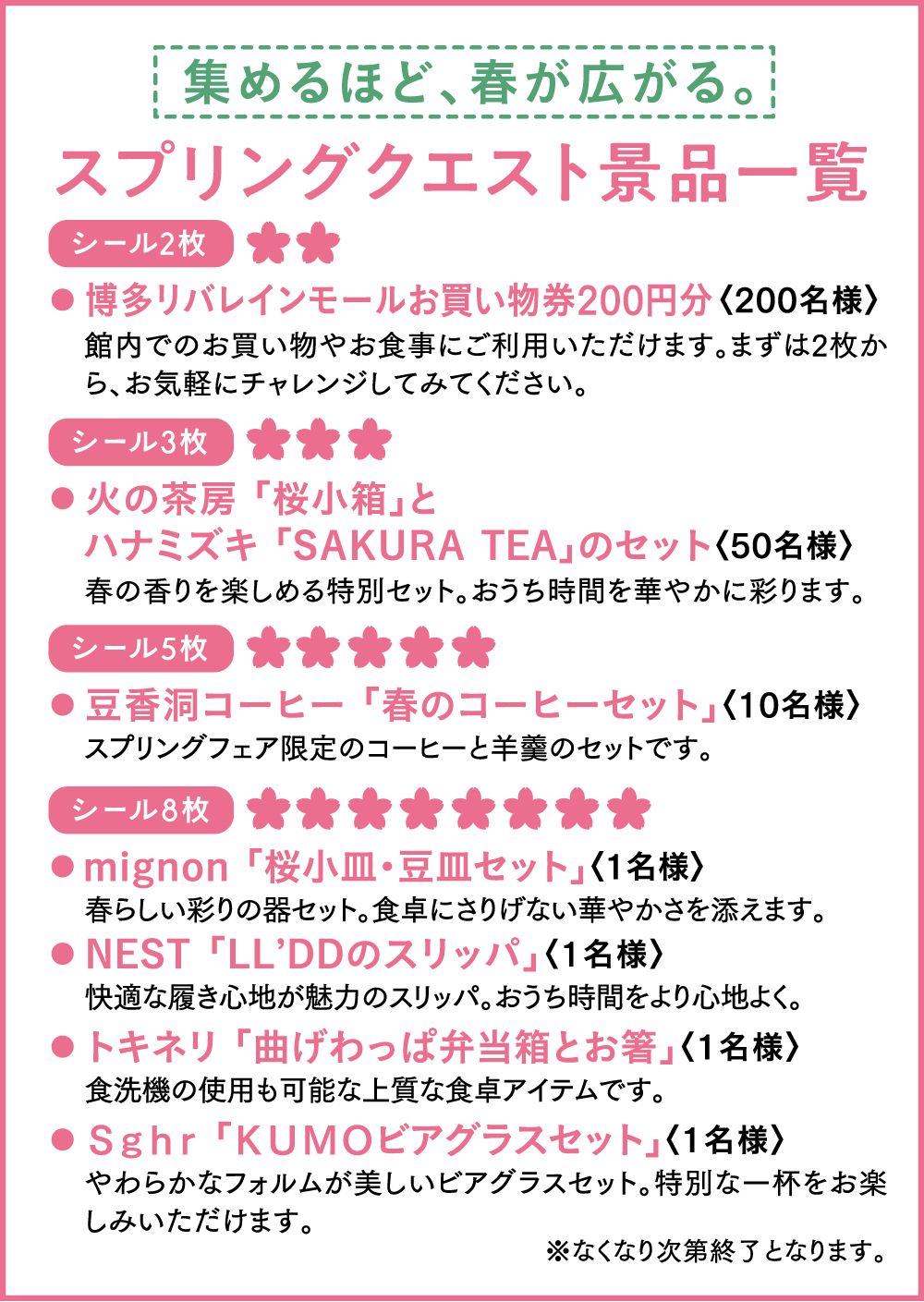 参加店を回ってシールを2枚以上集めると春の新生活を彩る景品をご用意しております。
