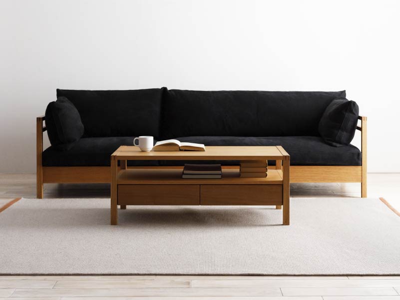 縁に広松木工オリジナル生地ピエトラ(帆布)を織り込んだウール100%のラグです。ソファと同じ生地、色を使用しており、統一感のあるリビング空間に仕上げます。