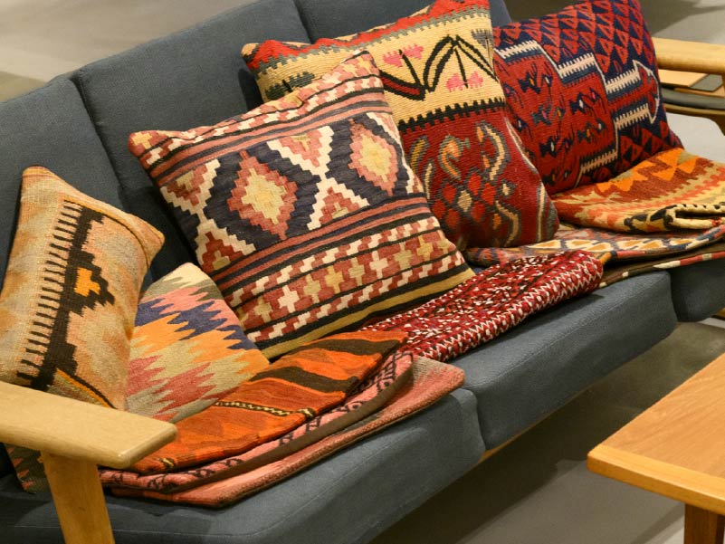 オールドキリムは遊牧民が生活用具として手織りにて作っていたもの。織り柄には個性があり、1点でも存在感のあるアイテム。秋色のコーディネートにもぴったりです。