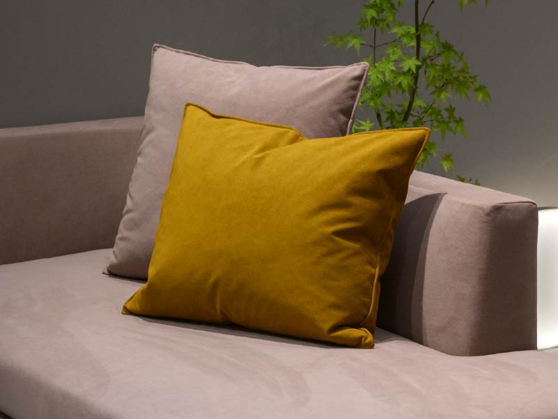 1つ置くだけえでグッと秋らしくなるマスタードイエローのクッション。ウルトラスエードという人工スエード生地で、しっとりと柔らかな肌触りと、傷・汚れにも強い、使いやすさが特徴です。