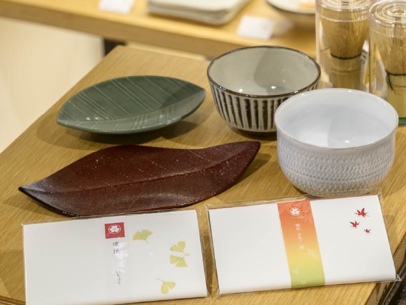 〈ポタリー〉の抹茶ボウル、鹿児島の抹茶と、葉っぱの型の器に懐紙を合わせて、一息お茶の時間を過ごしませんか。お好みの色柄を組み合わせてお楽しみください。