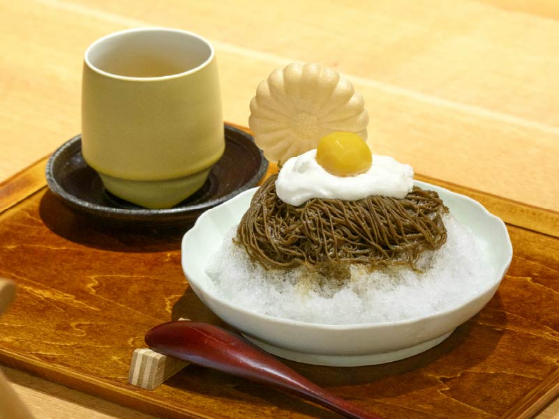 黒糖を使用したほうじ茶をたっぷりかけたかき氷にクリーミーで濃厚な「ほうじ茶モンブラン」をたっぷり絞ります。 ほうじ茶の香ばしさと栗の甘さが調和した味わいをお楽しみいただけます。