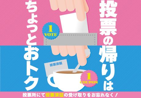 選挙割とは、投票所で交付される投票済証を対象店舗でご提示いただくと各種特典が受けられるサービスです。